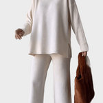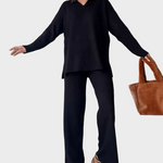 Pantaloni largi asortați: Pantalonii au un croi larg, care cade natural la fiecare pas, oferind un aspect grațios, dar casual. Croiala dreaptă îi face potriviți pentru uzul zilnic, păstrând în același timp un aspect modern și elegant. În combinație cu topul, creează o ținută echilibrată, care este în egală măsură stilată și confortabilă.